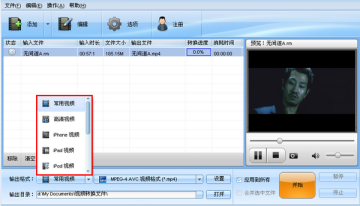 选择了相应的产品视频,就可以在第二个选项里选择具体要转换的视频格式啦。比如iPhone移动产品就包含了MPEG-4、H-264、可电视输出的MPEG-4、可电视输出的H-264等一系列不同的视频格式,不同的格式可满足用户不同的需求。