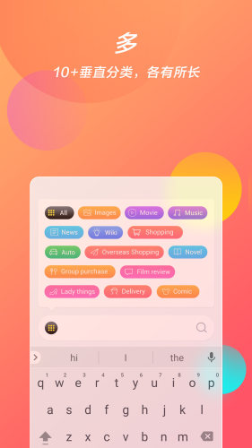 内置了十多个搜索分类:综合、影评、购物、小说、漫画、BT磁力、翻译等等,配合独有的“纯净模式”,让你有更好的搜索体验。