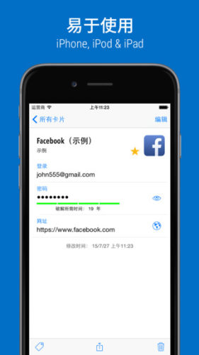 SafeInCloud 会评估你的密码的强度并显示每个密码的可破解指标。可破解指标以时间长度指示暴力破解密码所需时间。使用弱密码的帐户均标有红色的警告标志。