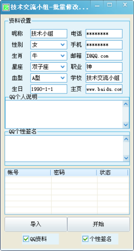 qqtz技术交流小组开发的批量修改QQ资料工具可以实现一键修改个人资料,点击批量登陆然后想把资料改成啥就改成啥,界面直观简洁,欢迎下载体验。