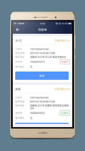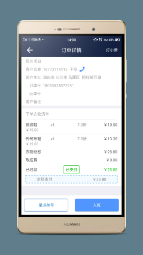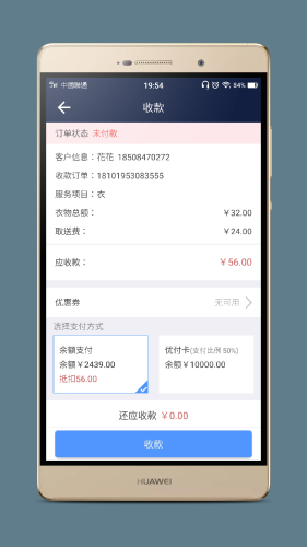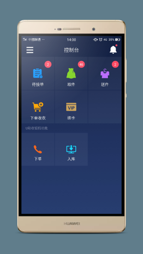 具有接单 、取件、送件、在商城下单、门店功能下单 、六合入库、提现、衣物计件、收款宝典等功能。