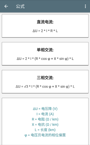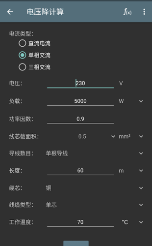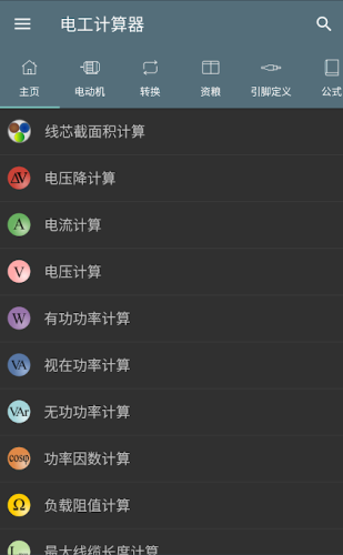 电工计算器破解专业版,一款适用于电工的手机计算工具,帮助电工轻松解决工作中遇到的各种计算问题,简单实用。软件可计算电压、线径、保险丝、电抗、电流等,让元器件选型更加简单。