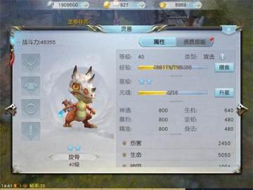 2、灵兽属性 点击已拥有的灵兽,可以查看该灵兽的各方面“属性”,例如:“等级”“经验”“伤害”“生命值”等等,点击右侧面板的资质技能可以查看该灵兽的“资质技能”;