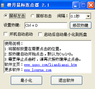 楼月鼠标连点器是一款界面简洁,功能实用的鼠标自动点击器软件。只需按一下指定热键后,软件即自动为您开始连续点击。使您从繁重重复的鼠标操作中解脱出来。