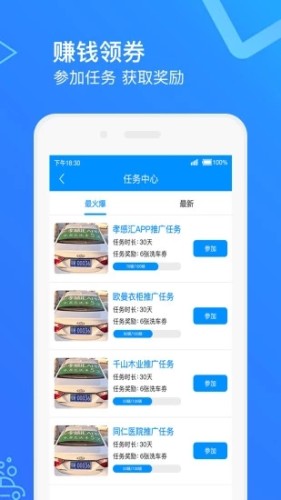 同时,加入了任务模块,让用户积极参与,免费赢洗车券,真正的将利益带给广大用户。