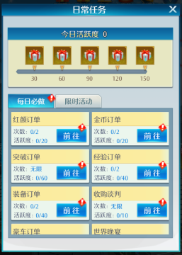游戏为总裁们准备了丰富的每日任务,完成相应的日常任务和限时活动,积累活跃值获取活跃奖励宝箱。日常任务每天十二点刷新,活跃度每日清空哦,总裁们记得及时领取活跃奖励。