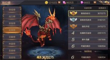 排行榜目前分为等级榜、战力榜、装备、坐骑榜、羽翼榜、神器榜、圣盾榜、竞技场等8种榜单。