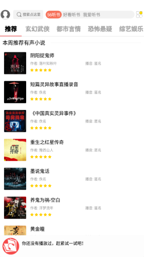 快试试这款听书软件吧,无需付费,无需充值,所有书籍全部免费收听,玄幻,武侠,都市,言情,恐怖,悬疑等三大来源,各大类别等你倾听,欢迎各位下载。