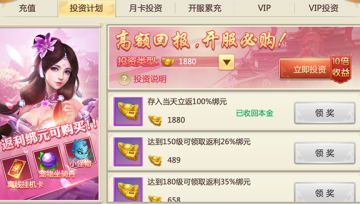 当上仙们达到60级后,就可以参与投资计划活动,同样的,投资当天立马收回本金,之后每达到指定等级,便会返还高比例的绑定元宝。