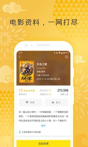 看电影就用票神app,支持5000+影院,覆盖全国各地;在线选座看重即可选中,随心超便捷;价格更多优惠,会员专享福利更多;还有电影资料,一网打尽所有电影资讯。