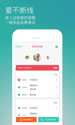 纽带:随时随地关心家人服药,一键远程提醒,免费发起通话。