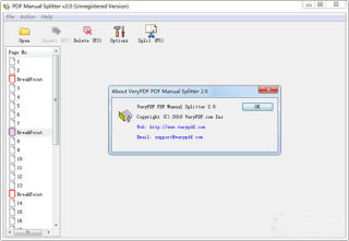 VeryPDF PDF Manual Splitter是一款专业的PDF分割软件,它是一个应用于Windows平台的程序,能够支持所有者密码保护的pdf文件,而且拆分pdf文件时,可以通过插入断电将pdf页面分组,帮助您将pdf文件拆分为较小的PDF文件,拆分好的文件不会影响上传,欢迎下载使用。