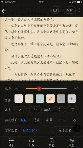 4、自定义阅读界面,设置翻页效果、背景、字号、亮度、字体等,还有听书功能解放你的眼睛。