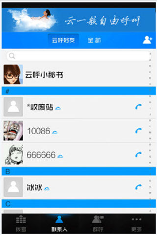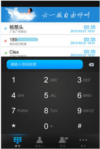 呼叫云呼好友,无限通话,无限快乐;突发事件?必须开会?手机会议一键搞定;多系统无缝兼容,还等什么,一起煲电话粥吧!云呼网络电话实现真正的“零”流量、零话费、去电显号的高清音质通话,资费全球最低,套餐资费低至0元!对方无需安装客户端,免费拨打全球手机固话,为用户省下数千万话费,真正的省话费神器,荣获“2012年最受欢迎网络电话”称号。 全球独创“群呼”功能,一键发起多方通话,无需对方安装客户端、无需wifi,享受企业旗舰级的高端功能!赶紧试一下吧!