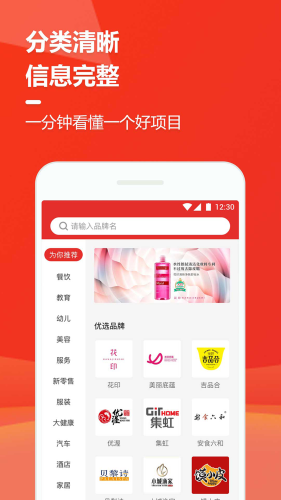 平台汇集60余个业态4万+优质创业项目,另有“大咖专访”“加盟宝典”“展会资讯”“加盟管家”等优质内容和免费服务。