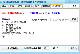 265G王朝霸域辅助是一款应用于王朝霸域游戏的辅助小工具;本辅助具备自动挂机,喊话,自动副本,征战的功能,绝不修改游戏数据;欢迎下载使用。