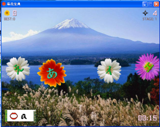 这是一个日文五十音图的打字游戏,游戏开始后会从屏幕下方喷出很多菊花,每朵菊花上面都带了一个日文假名(不要问我为什么菊花里面会有日文假名,我也不知道⊙﹏⊙),在听到某个假名的读音后点击相应的菊花,如果菊花轰的一声爆掉了,那么恭喜你——答对了!