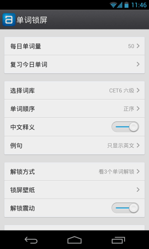 -复习模式:向右滑动单词,进入复习模式。在复习模式可以浏览已经看过的所有单词。按下手机锁屏按键,让手机进入锁屏状态,则自动退出复习模式。