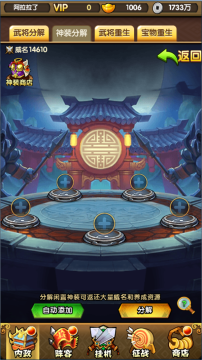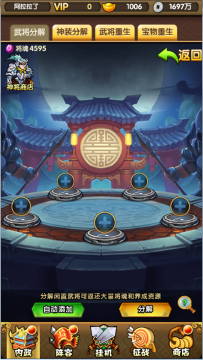 武将分解:分解多余武将,获得武将将魂,在分解过程中,除了返还玩家培养武将的所有消耗外,还会有可以在神将商店里兑换道具的武将将魂!