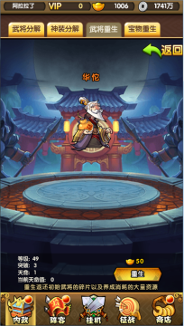 武将重生:武将重生可将指定武将重生成为1级并返还该武将的所有培养消耗,所以,重生的时候一定要三思啊!