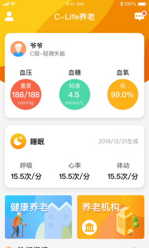 C养老app下载,实时关注老人健康,智能检测家居养老更放心,C养老app及关心老人身体健康,也关注老人文娱生活,更有丰富的养老资讯信息,欢迎下载了解。