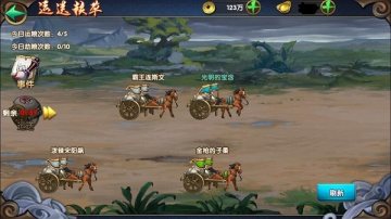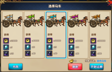 运送粮草的第一步是选择马车,马车分为5种颜色,奖励也依次递增。可使用20元宝刷新马车品质(每天有2次免费重置机会)。