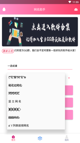 QQ网名助手,一款便捷的网名生成工具,拥有花藤网名、圈圈网名、带刺网名、菊花文网名等多种网名模板,还支持空白网名的生成,帮助您制作出专属于您的QQ、微信网名。
