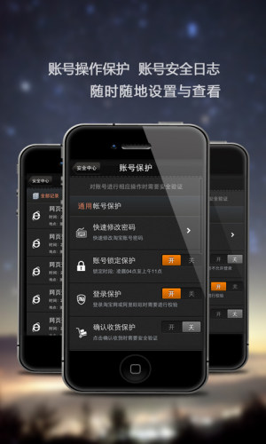 淘宝安全中心是一款淘宝安全购物软件,是您的御钱侍卫,护号使者,打造的淘宝网购安全软件。让您在淘宝账号、金钱、个人信息得到更高级别保护的同时,享受独一无二的便捷操作。