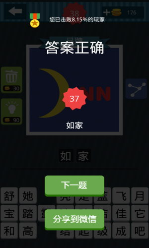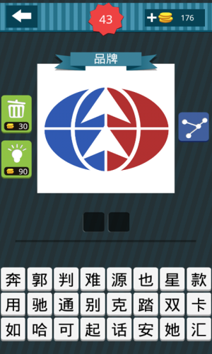 如果有的题目实在答不上来,就可以选择图片左边的两种提示工具。其中“垃圾桶”需要花费30个金币,能够帮你消除一个错误答案的文字;而“电灯泡”则要花费90个金币,能够提供一个文字提示。