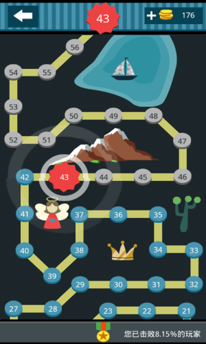 进入游戏界面我们会看到一个跟游戏棋挺像的路线图,上面的每一个原点就是每一个关卡。点击一个关卡就会弹出开始按钮,点击按钮就正式进入关卡答题了。