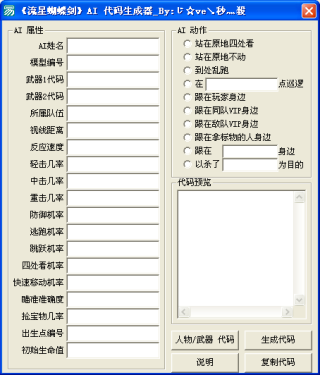 流星蝴蝶剑是一款很经典的国产单机游戏,现在依然还是有很多人在玩,随着联机的玩家少了,为了增添游戏的乐趣,提供流星蝴蝶剑AI代码生成器下载使用,可以按照自己的需求生成电脑AI,享受人机对战的乐趣,赶紧下载体验吧。