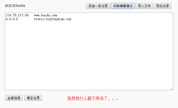 极路由增强组件是一个基于UserScript的增强组件,可以帮助你直接在编辑界面导入,导出,改用传统的编辑器编辑等。为什么要制作这么一个组件呢,因为这极路由支持自定义Hosts,可惜的是官方提供的编辑工具永恒的一行编辑器,只能一行一行加,一行一行删,不能导入什么的,所以写了这个编辑器。