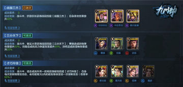 例如,三国组合“河北庭柱”由颜良、文丑、高岚和张郃组成,部队中只需要有4人中的两人便可激活技能“如臂使指”;幕府组合“龙虎狮”由上杉谦信、武田信玄和北条氏康组成,其中两人在同一部队即可使部队大营获得技能“来势汹汹”。