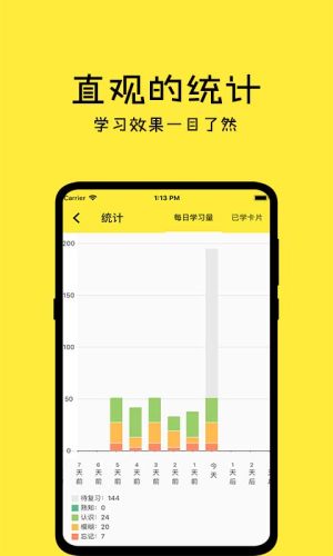 分类卡包管理你的复习计划,随时查看不同类的卡包学新及复习进度;记一学习app提供各类数据线分别查看全部学习的数量、已学数量、需复习数量等等。让清晰真实的数据观察自己的进步和成就。