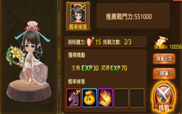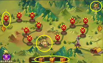 (1)点击关卡可以进行副本的推进,每个关卡有三个难度选择,每个难道挑战成功会增加一个星星,需要注意的是每个难度实力会递增,所以自己的实力也是决定是否能挑战成功的关键;每个关卡第6关和最后一关都会有相对高级的装备碎片掉落,是提升实力的必要通道(小技巧:如果实力相差不大久攻不下,不妨试试更换阵型站位;另外还需要注意的是关卡中的敌人有时拥有超高的物防或魔防,所以选择物理攻击还是魔法攻击的武将也需要提前考虑好哦~)