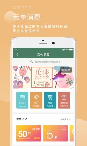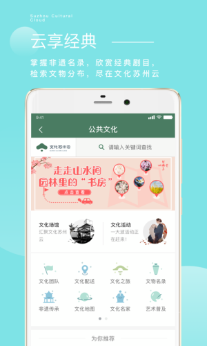文化苏州云app下载,拥有更多苏州文化传承与活动资讯,在文化苏州云app用户可以了解更多苏州文化信息,也可以预定文化场馆,或是在线购买文化产品等,了解一下!