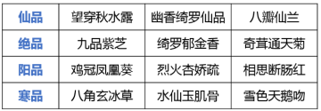 重点来啦!敲黑板:仙品有12种,每种仙品分3个品质,分别是S、A+和A。总计36个仙品,分别是: