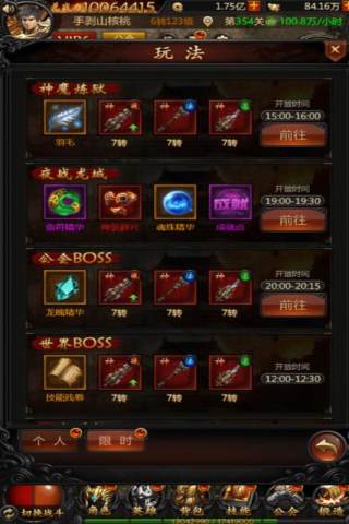 《弑魂online》秉承了放置类传奇游戏的轻松放置的轻松玩法。游戏的自动挂机刷怪功能让玩家快速升级,挑战BOSS、锁妖塔、竞技、闯天关、天梯赛等丰富的PVE、PVP让玩家感受即时战斗的热血。全地图自由PK、杀人爆装、BOSS争夺,再现沙城盛况!