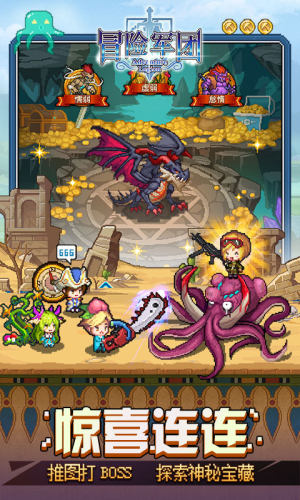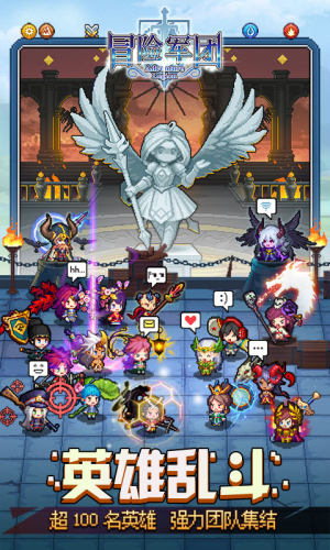 冒险军团,一款非常纯正的像素风挂机冒险手游,游戏非常精致的像素画面风格,给玩家们更加轻松怀旧感觉,还有海量的手游福利让你拿到手软,上百名知名英雄等你召唤,让你真正过把瘾。