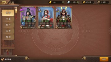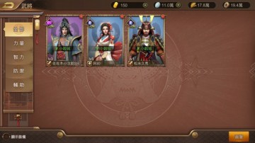 在主界面右下方菜单中点击“武将”,进入武将列表页面,该页面以武将等级、稀有度为依据,将武将依次排列,在列表的左侧,将已经拥有的武将按照力量、智力、防御和辅助分类。