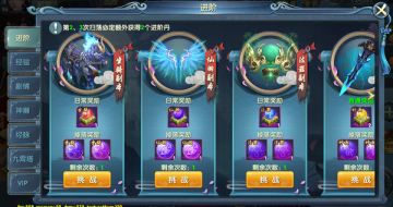 A、左边为菜单栏,分为:进阶、经验、剧情、神器、经脉、九霄塔、vip。