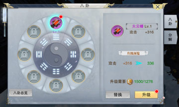 新入手的八卦等级为1级,通过消耗八卦点数,可以最高将八卦升至50级。等级越高的八卦能提供越多的属性加成,而通过分解无用的八卦或者八卦精华,可以获得大量的八卦点数。