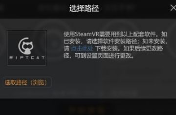 3、如果您未安装RiftCat ,或者您修改了RiftCat 的安装路径。点击“开始游戏” 后,可以自主选择RiftCat在您PC上的安装路径或者根据我们提供的推荐链接下载RiftCat以及在手机上安装的Vridge(这两个软件需要配合对应的版本使用,因此请尽量在NOLO助手提供的链接下载)。