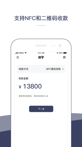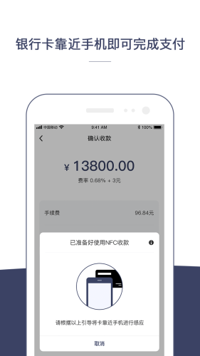 收乎可使用手机自带的NFC功能,收款只需支付方将银行卡贴近手机,即可感应触发NFC功能,只需简单输入银行卡密码,即可完成收款,秒到账。
