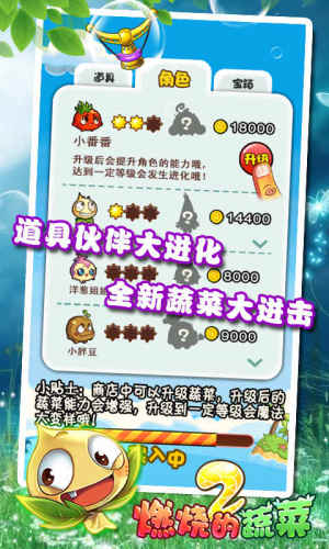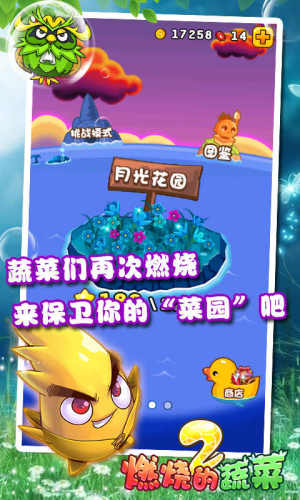 燃烧的蔬菜2安卓版开启全新场景--“月光花园”浪漫登场。新玩法、新伙伴、新地图,传承经典、缔造新剧情。够胆、够聪明就来“月光花园”挑战吧。燃烧的蔬菜2,将2欢乐到底。新版本拥有全新怪物家族,全新故事,全新系统,蔬菜家族新伙伴,华丽升级.燃烧的蔬菜2游戏中原本的Q版小清新风格依然得以保留。戏里的蔬菜形象,看起来呆头呆脑,更加有趣,绝对是女朋友一看就喜欢。
