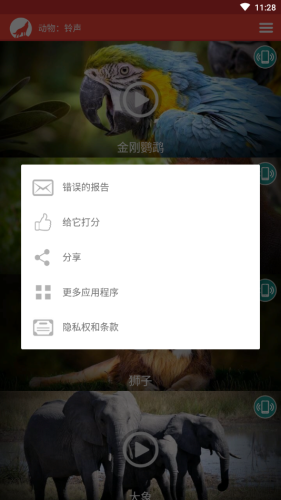 100多种动物来自世界各地的铃声,支持40种语言 设置为铃声 设置为铃声联系 设置为通知/短信 设置为闹钟 原创铃声,闹钟和通知哦!