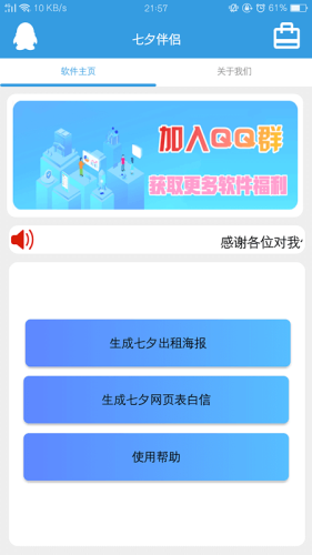 本软件可以一键帮你生成七夕出租自己的广告支持添加收款二维码和自己头像还有自定义词语还可以一键生成七夕表白信,并且支持百度搜索。
