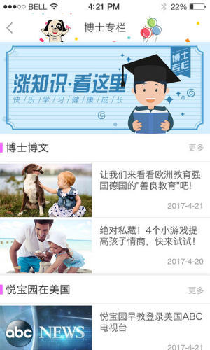 悦宝园,一款高端的早教软件,提供大量优质课程,激发宝宝的想象力,提升宝宝的个人能力。下载使用悦宝园app,让家长更快的了解各种早教资讯,让孩子更快学习早教知识。