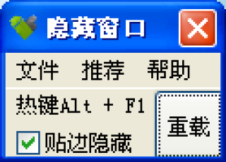 由BugCode杀进程网推出的一款窗口隐藏工具,可以任意使用,但是禁止逆向,运行后,先让需要隐藏的窗口处于活动状态(点击该窗口标题栏),然后按下快捷键,此时该窗口已成为“待隐藏”窗口。之后任何时候只需按下快捷键就会隐藏该窗口。当想换个窗口隐藏的时候.点击重载即可,支持给任意窗口加上老板键,默认快捷键 Alt+1,可多次运行(Alt+2/3),隐藏多个窗口。