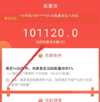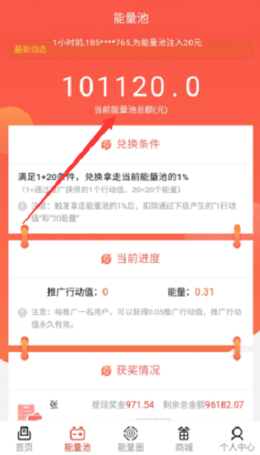 每推广一个好友注册可以获得0.05推广行动值永久有效,外加1点能量值,当邀请满20个徒弟在商城里购买东西获得20点能量时即可获得能量池总金额1%的分红奖励,能量池金额为10万元起步,所以1%也就是1000元,当触发拿走能量池的1%奖金后,会扣除下级产生、1点行动值和20点能量。